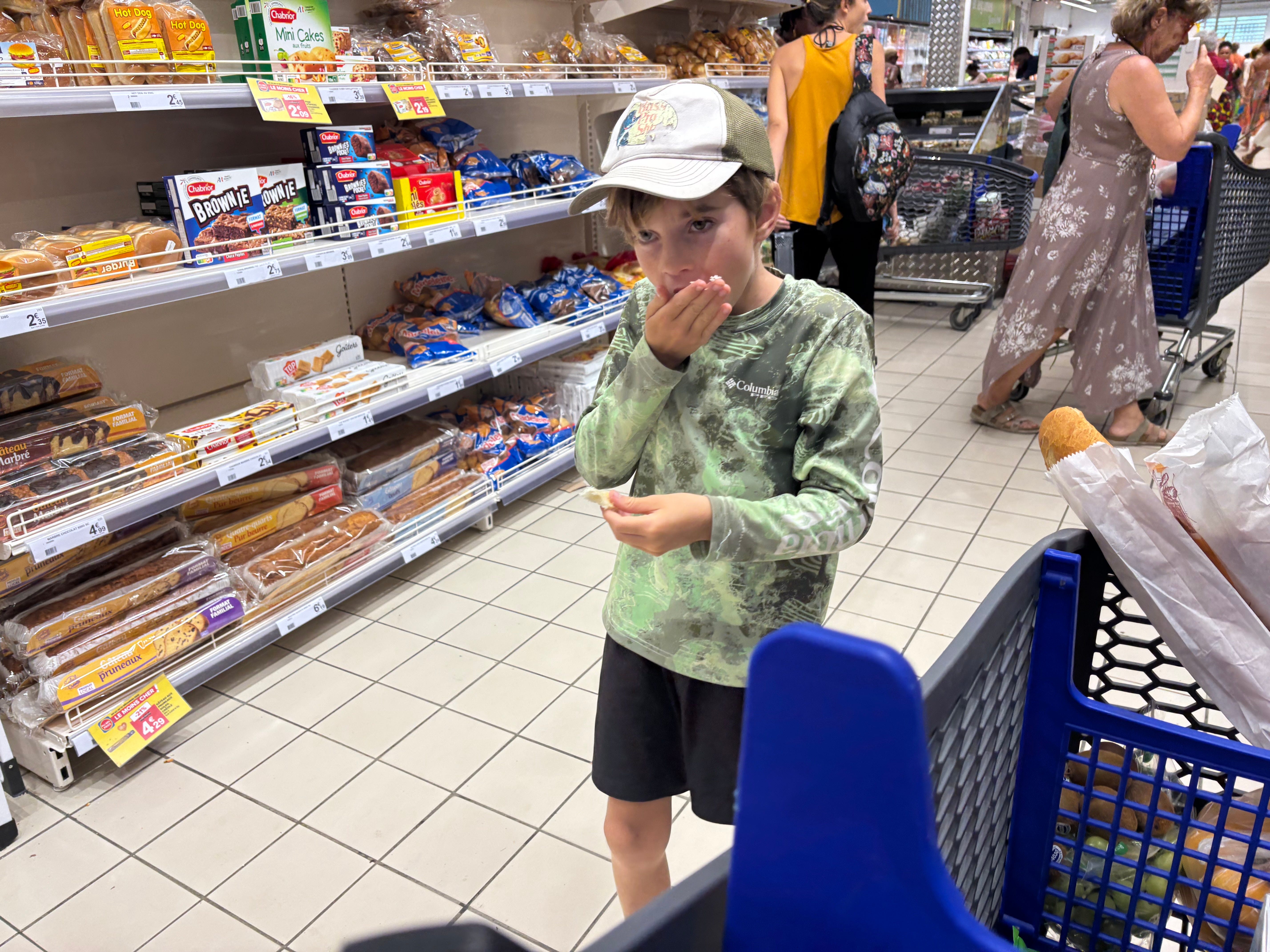 We arrived in Sainte-Anne/Le Marin, Martinique earlier this week on Dec 2nd, and although it’s been quite rainy, we have been going hog wild provisioning at some great French grocery stores. The quality is better than what we’ve seen the last few months, and the prices are much more reasonable. The kids are no longer rationed to a single cutie, apple, banana, etc per day … it’s no limits for now. I’ve filled 5 grocery carts so far and hope not to do this much shopping again until Costco in Puerto Rico. We’ve got cream back onboard (although it’s shelf stable), so the coffee is delicious once again. It’s a fun way to learn French, going through the aisles and reading the labels and translating to English. Rabbit liver Pâté anyone?